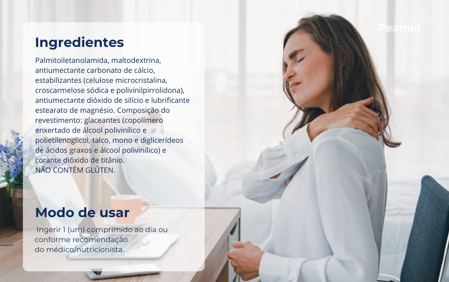 Peamid® tem seu uso recomendado para auxiliar o tratamento de dores e inflamações, principalmente em quadros de fibromialgia, dores lombares, nos nervos, em doenças osteoarticulares, artrite, artrose e osteoartrite dos joelhos. Melhora significativamente a qualidade de vida do usuário com a vantagem de ser bem tolerado e não apresentar reações adversas nem efeitos colaterais com uso a longo prazo.